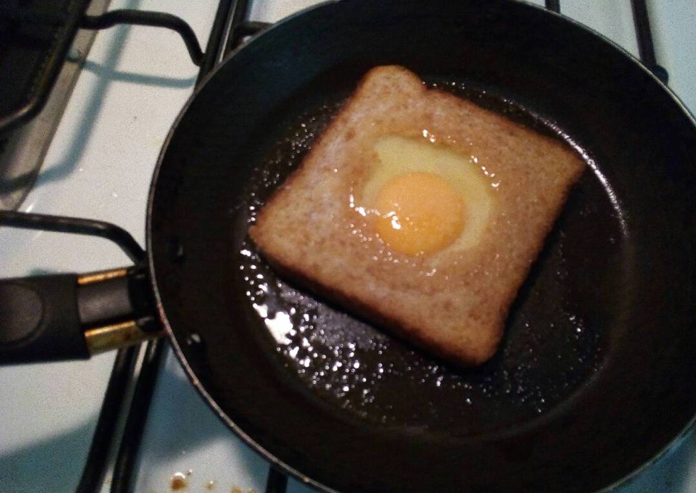 - En una sartén caliente a fuego medio, pon un poco de mantequilla, derrite y pon el pan del lado que no tiene. Pon el huevo en el centro agrega sal, tapa y deja que el huevo cuaje.
