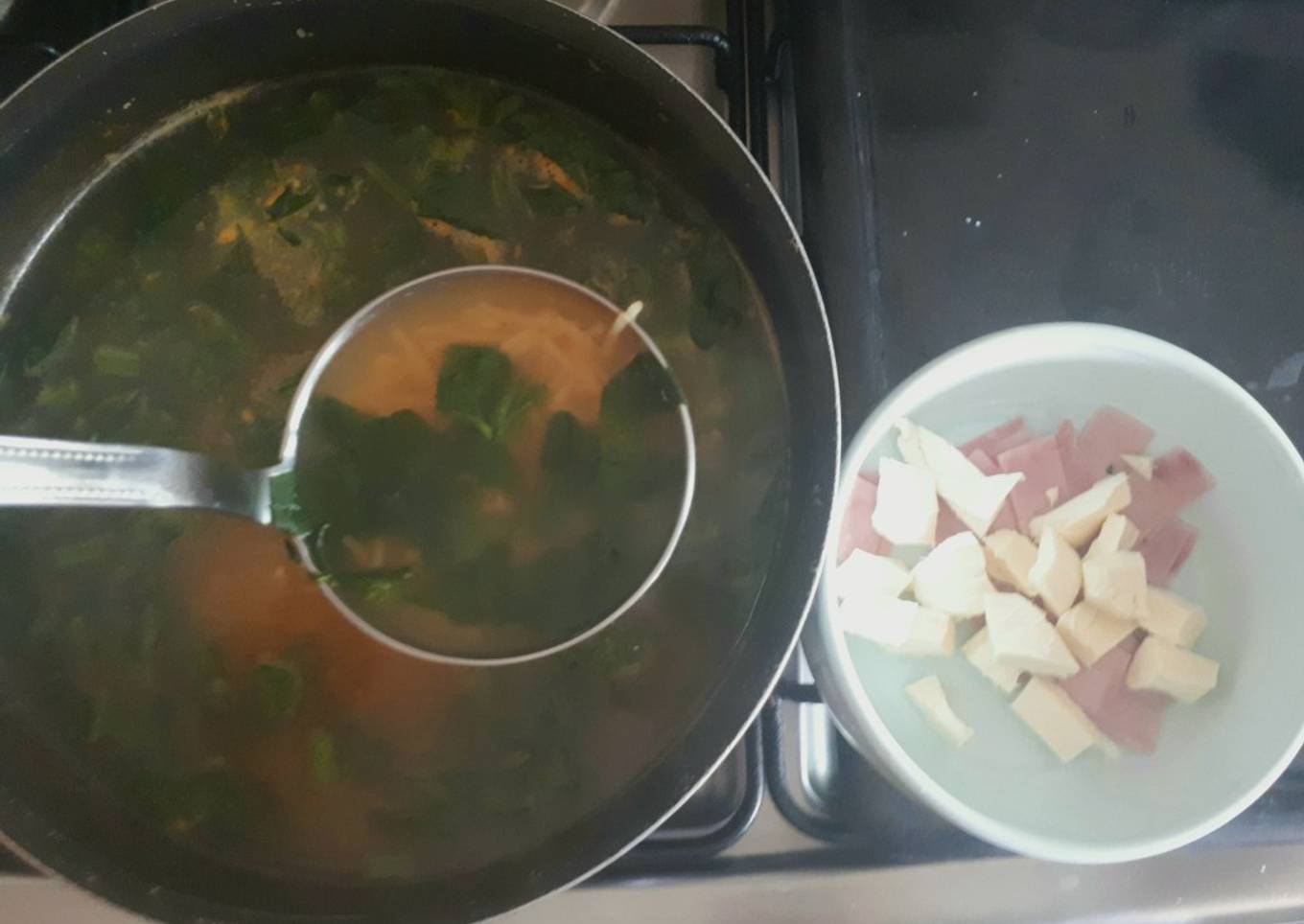 Steps to make to make Sopa deliciosa de fideos con espinacas, queso y jamón