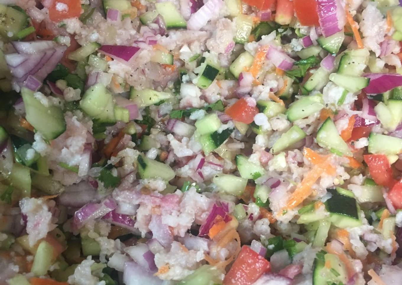 - Pelar la zanahoria y el pepino y todo cortarlo en cubitos muy pequeños (la zanahoria rallada) Pasados 30 min agregar los vegetales al pescado + pimienta + sal + aceite de oliva y mezclar bien.