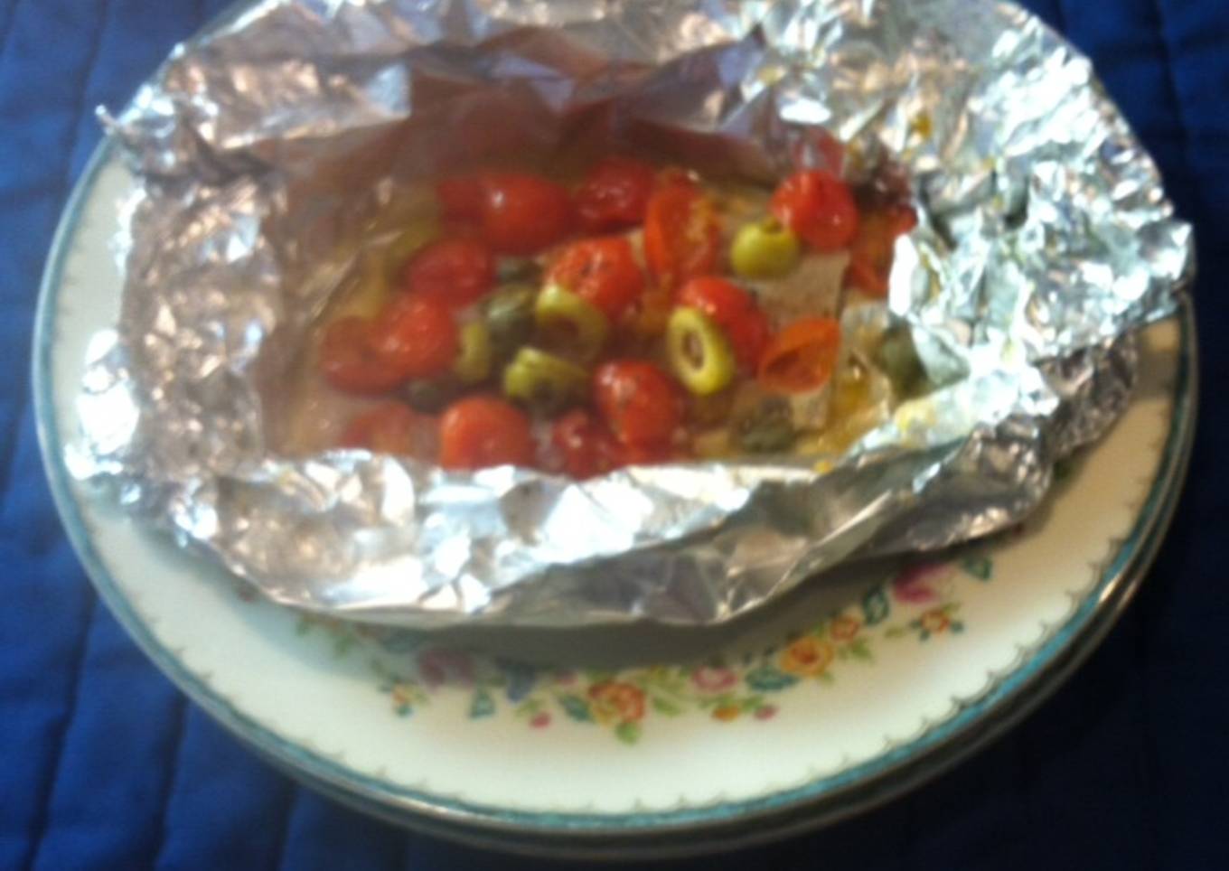 - Continuando con la receta sobre cada filete ponemos un diente de ajo picadito, échalot picado, alcaparras, unas aceitunas cortadas en rebanadas, unos 10 o 12 jitomatitos cherry cortados a la mitad, sal, pimienta y un chorrito de aceite de oliva, cerramos nuestros paquetitos y los ponemos en la vaporera 20 minutos.