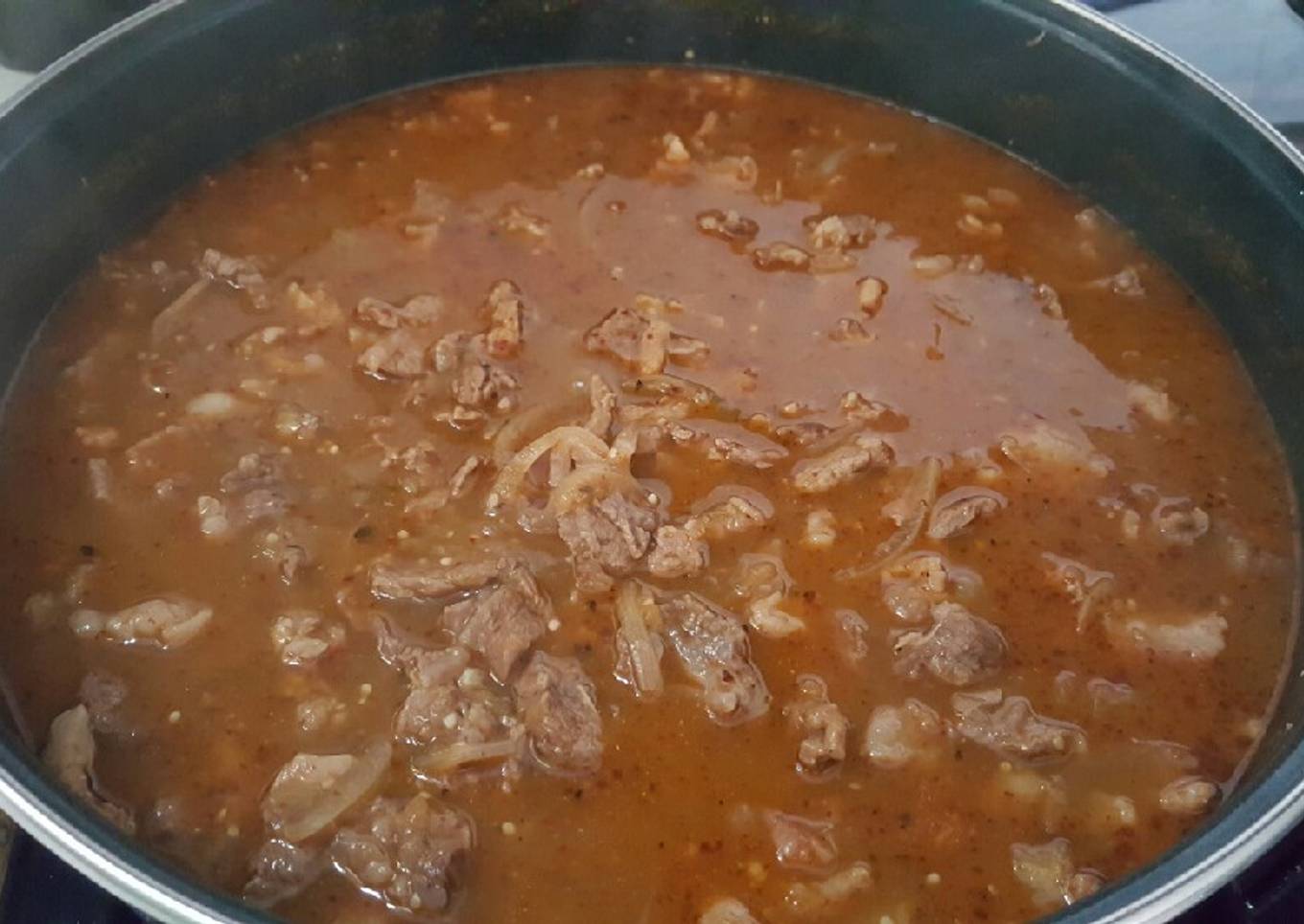 - Deja que la cebolla se sofría y cuando esté lista Le agregas la salsa de tomate, los cubitos de knorr lo tapas y lo dejas a fuego lento unos 10 minutos, rectifica de sal y listo a disfrutar de esta carnita con Chile acompañada de frijolitos recién cocidos