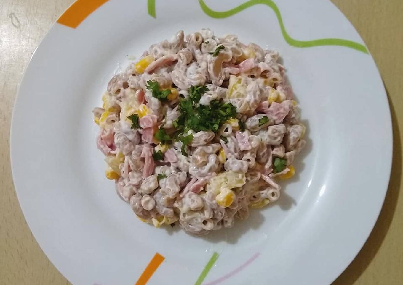 - Integrar los elementos con la pasta ya fría (el jamón, queso, granos de elote, piña sin el almíbar), por último la crema, mayonesa (son dos tantos de crema por uno de mayonesa) y una pizca de pimienta.