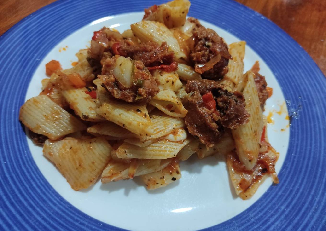 Macarrón con chorizo ahumado, papa y zanahoria